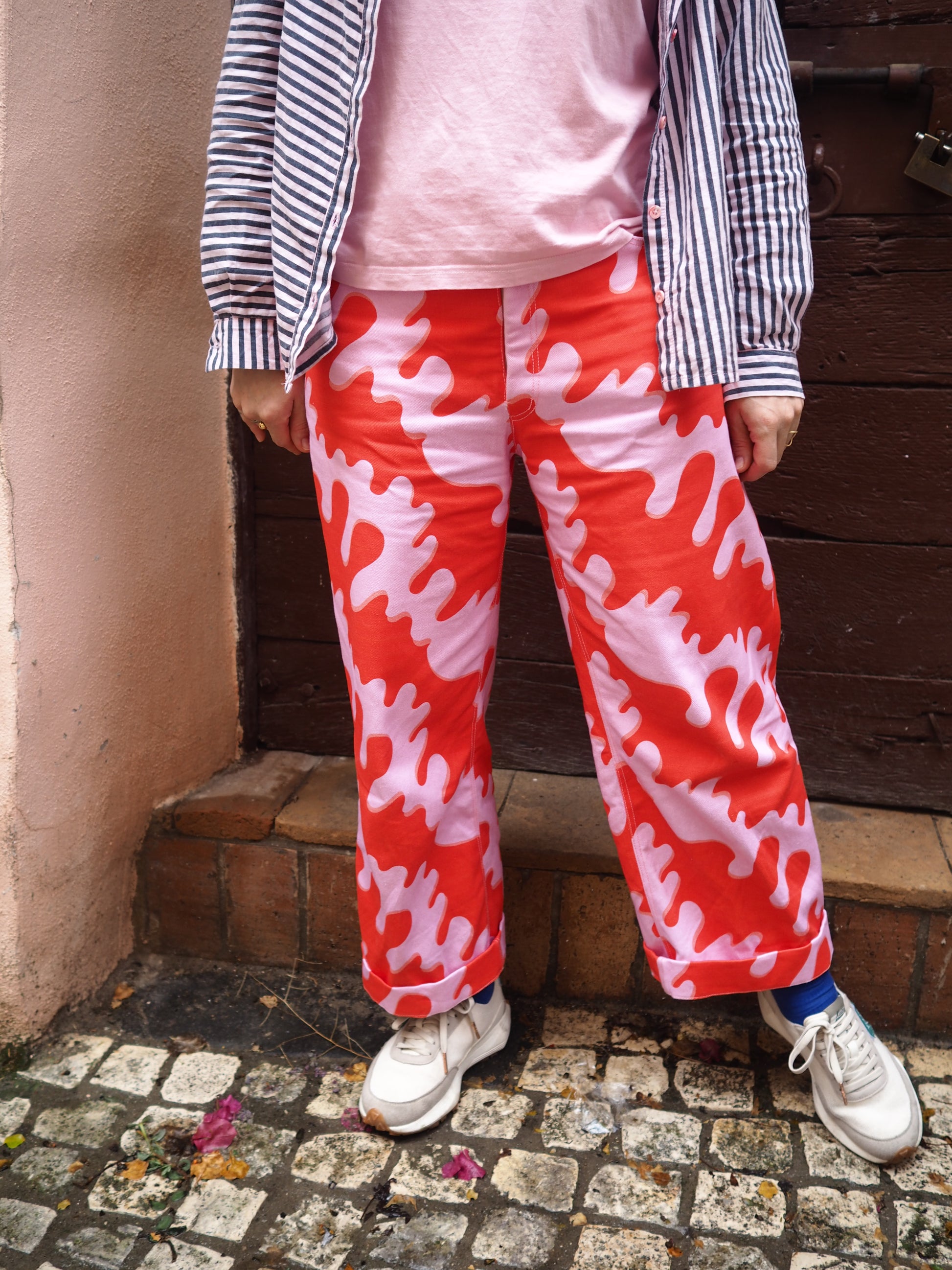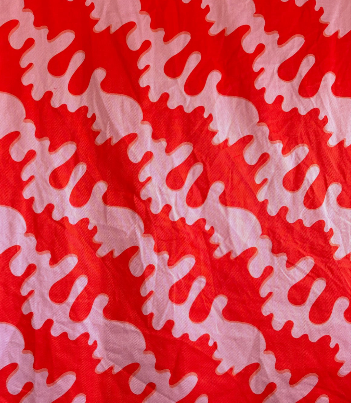Forhåndsbestilling av stoffet Drypp Denim i rødt og rosa. Antallet er delt inn i 0,5 m og 1 m, slik at du kan bestille den mengden som er best for deg. Velg antall meter i hele eller halve for å få rett mengde. Det blir klippet som en hel lengde.